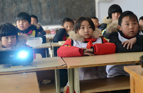 郭寨小学的留守儿童收到了捐赠的羽绒服、文体用品和教学用具等物资