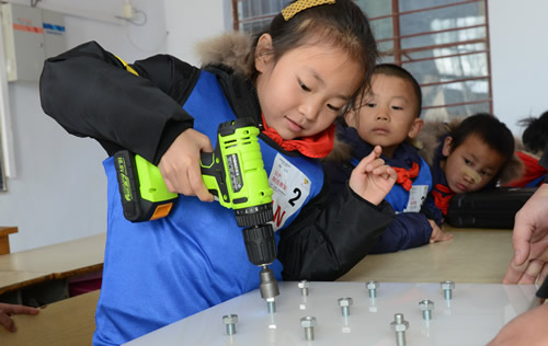 孩子们在筑梦课堂上学习扭矩扳手的使用