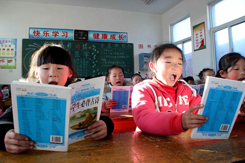 12月6日,内黄县亳城乡第三小学的学生在读古诗。为打造古诗书香校园,该校统一购置《小学生必背古诗》,统一编号,统一包皮,人手一本循环使用,期末回收,每周定时读背,定期举行古诗词系列读书评比活动。据了解,该校已将此活动连续举行4年,既增加了孩子们的知识储备,又节约了课本资源。