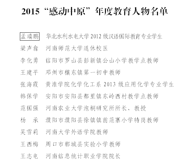 2015年,全省教育系统高举中国特色社会主义伟大旗帜,以邓小平理论、“三个代表”重要思想、科学发展观为指导,深入学习贯彻习近平总书记系列重要讲话精神,围绕立德树人根本任务,深入开展中国特色社会主义和中国梦宣传教育,深入开展社会主义核心价值观学习教育,坚持团结稳定鼓劲,正面宣传为主,深入挖掘宣传全省教育系统涌现出的先进典型人物,扎实推进未成年人思想道德建设、大学生思想政治教育和师德建设,涌现出一大批先进模范人物。为表彰先进,树立典型,推动工作,经组织评选推荐和公示,决定授予华北水利水电大学2012级汉语国际教育专业学生孟瑞鹏等11名同志2015“感动中原”年度教育人物荣誉称号。