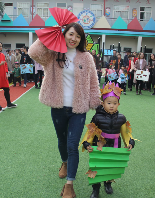 11月14日,济源市实验幼儿园的校园里,爸爸妈妈和孩子们一起动手,用剪、拼、粘、画等多种方式,将树叶变成了超人的帽子、美丽的裙子、迷人的眼镜、王者的面具、魔法师的魔杖、晶莹的披风、形象生动的树叶画等等各种各样的“艺术品”。随后,家长将孩子打扮成为树叶的代言人,孩子们身着“树叶服装”,在富有节奏感的音乐中进行了小模特走秀,将“树叶艺术品”展示给所有的小朋友和家长。