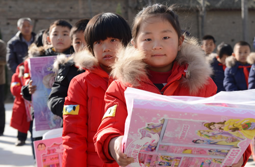 郭寨小学的留守儿童收到了捐赠的羽绒服、文体用品和教学用具等物资