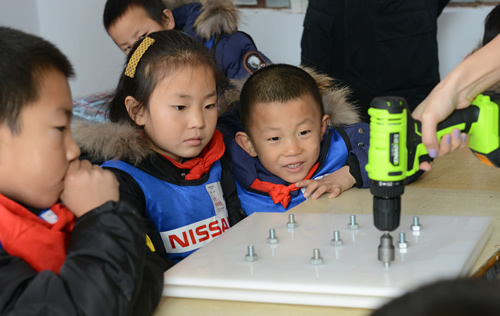 孩子们在筑梦课堂上学习扭矩扳手的使用