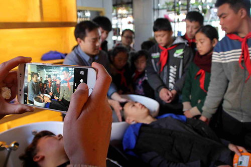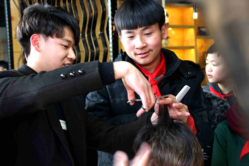 11月23日,内黄县特殊教育学校部分师生代表走进一家理发店,孩子们把亲手做的精美手工艺品送给该理发店的哥哥姐姐,感谢他们长期以来为学校师生义务理发。同时,理发师们还现场指导培训了孩子们如何洗发、理发。