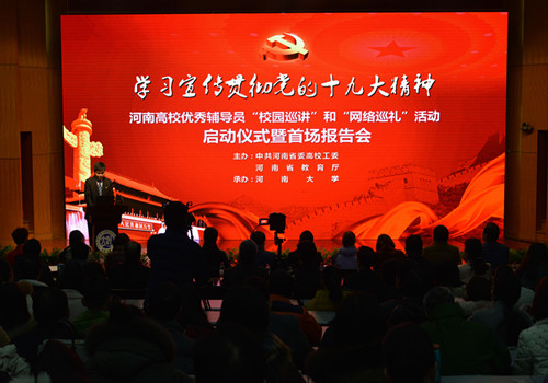 12月13日,“学习宣传贯彻党的十九大精神——河南高校优秀辅导员‘校园巡讲’和‘网络巡礼’活动”启动仪式暨首场报告会在河南大学举行。省委高校工委专职副书记、省教育厅党组副书记郑邦山出席启动仪式并讲话。